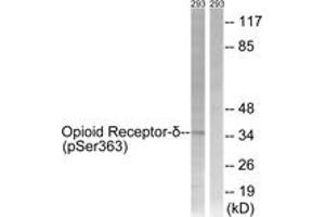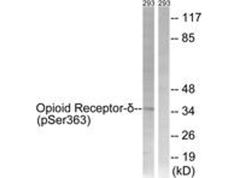 Opioid Receptor-delta (Phospho-Ser363) Antibody detects endogenous levels of Opioid Receptor-delta only when phosphorylated at Ser363.