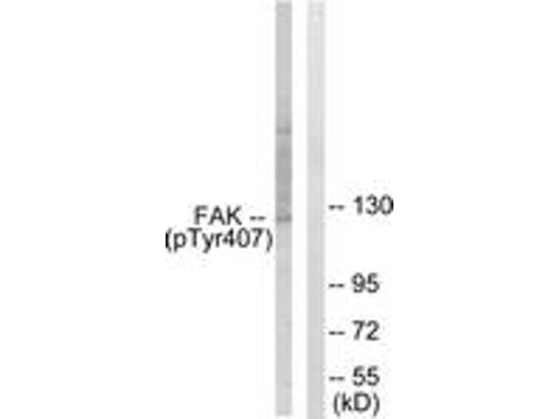 FAK (Phospho-Tyr407) Antibody detects endogenous levels of FAK only when phosphorylated at Tyr407.