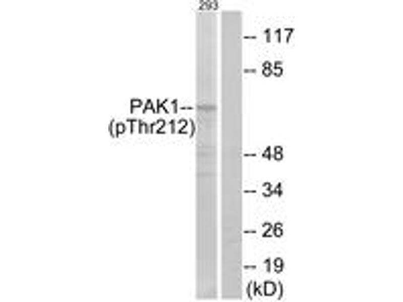 PAK1 (Phospho-Thr212) Antibody detects endogenous levels of PAK1 only when phosphorylated at Thr212.