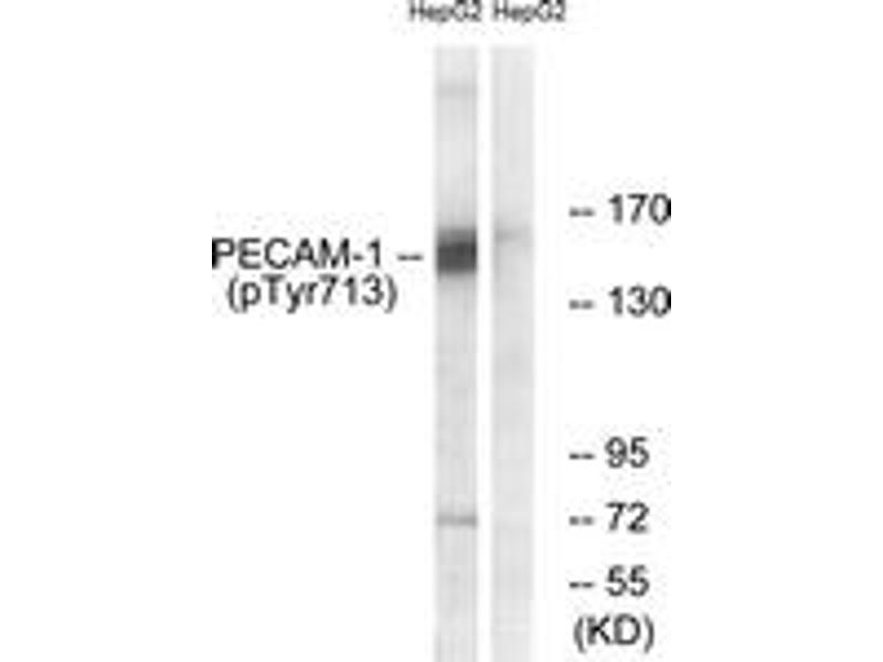 PECAM-1 (Phospho-Tyr713) Antibody detects endogenous levels of PECAM-1 only when phosphorylated at Tyr713.