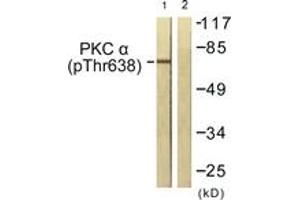 PKC alpha (Phospho-Thr638) Antibody detects endogenous levels of PKC alpha only when phosphorylated at Thr638.