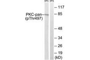 PKC-pan (Phospho-Thr497) Antibody detects endogenous levels of PKC-pan only when phosphorylated at Thr497.