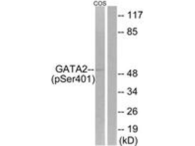 GATA2 (Phospho-Ser401) Antibody detects endogenous levels of GATA2 only when phosphorylated at Ser401.