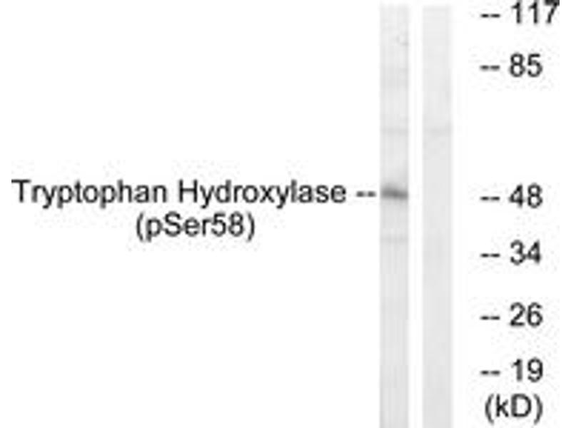 Tryptophan Hydroxylase (Phospho-Ser58) Antibody detects endogenous levels of Tryptophan Hydroxylase only when phosphorylated at Ser58.