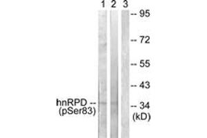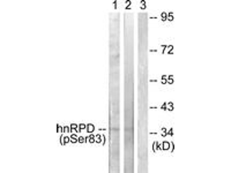 hnRPD (Phospho-Ser83) Antibody detects endogenous levels of hnRPD only when phosphorylated at Ser83.
