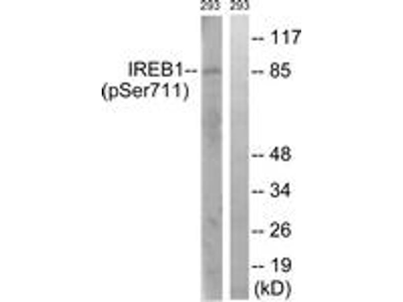 IREB1 (Phospho-Ser711) Antibody detects endogenous levels of IREB1 only when phosphorylated at Ser711.