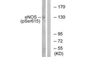 eNOS (Phospho-Ser615) Antibody detects endogenous levels of eNOS only when phosphorylated at Ser615.