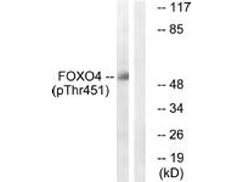 FOXO4 (Phospho-Thr451) Antibody detects endogenous levels of FOXO4 only when phosphorylated at Thr451.