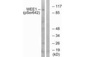 WEE1 (Phospho-Ser642) Antibody detects endogenous levels of WEE1 only when phosphorylated at Ser642.