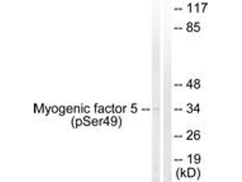 Myogenic Factor 5 (Phospho-Ser49) Antibody detects endogenous levels of Myogenic Factor 5 only when phosphorylated at Ser49.
