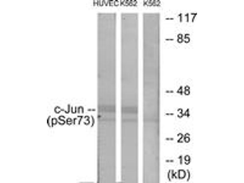 c-Jun (Phospho-Ser73) Antibody detects endogenous levels of c-Jun only when phosphorylated at Ser73.