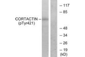 Cortactin (Phospho-Tyr421) Antibody detects endogenous levels of Cortactin only when phosphorylated at Tyr421.