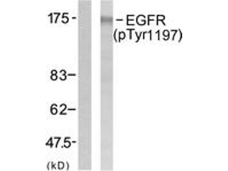 EGFR (Phospho-Tyr1197) Antibody detects endogenous levels of EGFR only when phosphorylated at Tyr1197.