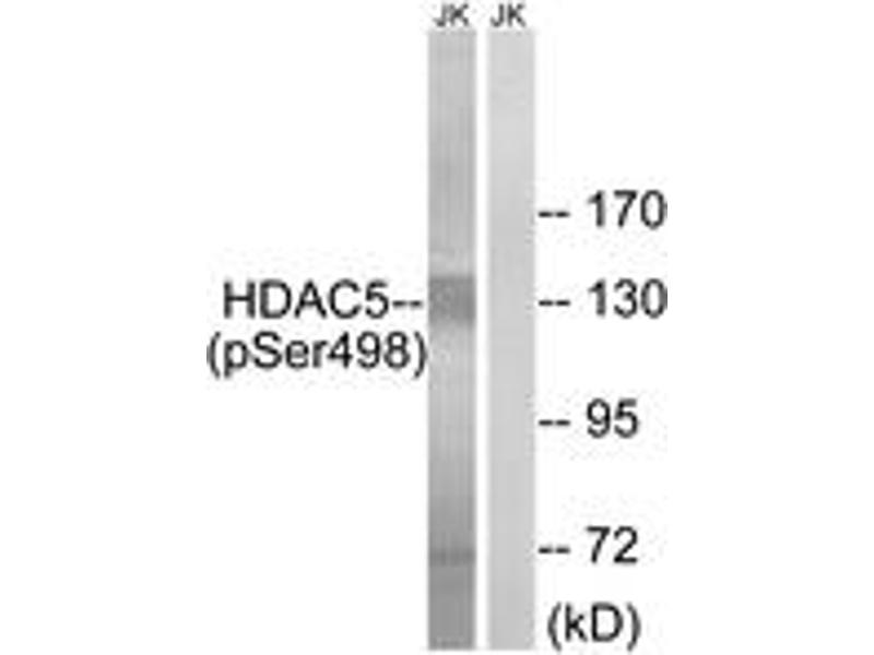 HDAC5 (Phospho-Ser498) Antibody detects endogenous levels of HDAC5 only when phosphorylated at Ser498.