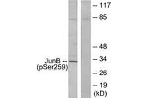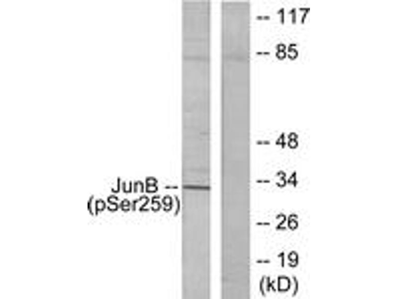 JunB (Phospho-Ser259) Antibody detects endogenous levels of JunB only when phosphorylated at Ser259.