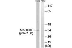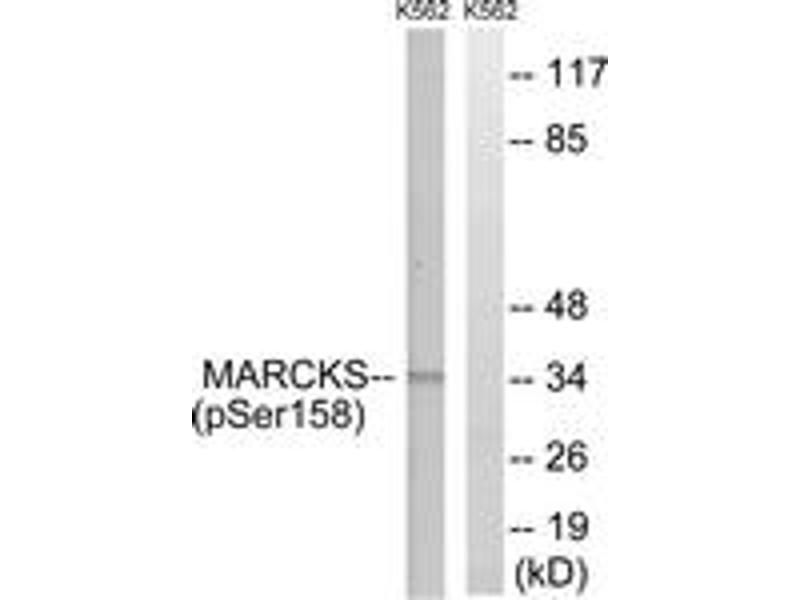 MARCKS (Phospho-Ser158) Antibody detects endogenous levels of MARCKS only when phosphorylated at Ser158.