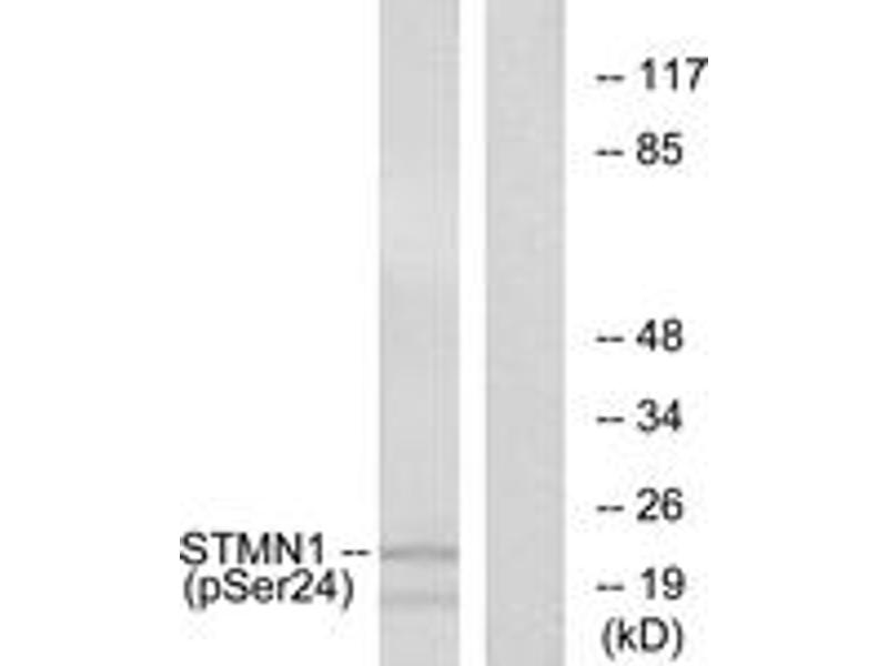 Stathmin 1 (Phospho-Ser24) Antibody detects endogenous levels of Stathmin 1 only when phosphorylated at Ser24.