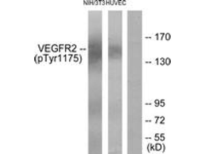 VEGFR2 (Phospho-Tyr1175) Antibody detects endogenous levels of VEGFR2 only when phosphorylated at Tyr1175.
