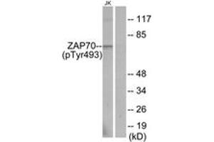 ZAP-70 (Phospho-Tyr493) Antibody detects endogenous levels of ZAP-70 only when phosphorylated at Tyr493.