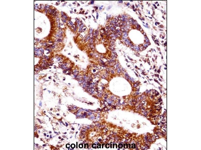 CEA-related cell adhesion molecule 7 (CEACAM7,CGM2) belongs to the carcinoembryonic antigen (CEA) family. It encodes a glycosyl phosphatidyl inositol (GPI)-linked glycoprotein which is only found on the apical surface of highly differentiated epithelial cells adult colon and on a small epithelial cell population in pancreatic ducts. CEACAM7 expression is completely lost upon malignant transformation already in hyperplastic polyps and early adenomas as well as in adenocarcinomas of the colon. Like all members of the CEACAM family, it consists of a single N domain, with structural homology to the immunoglobulin variable domains, followed by one immunoglobulin constantlike A domain.