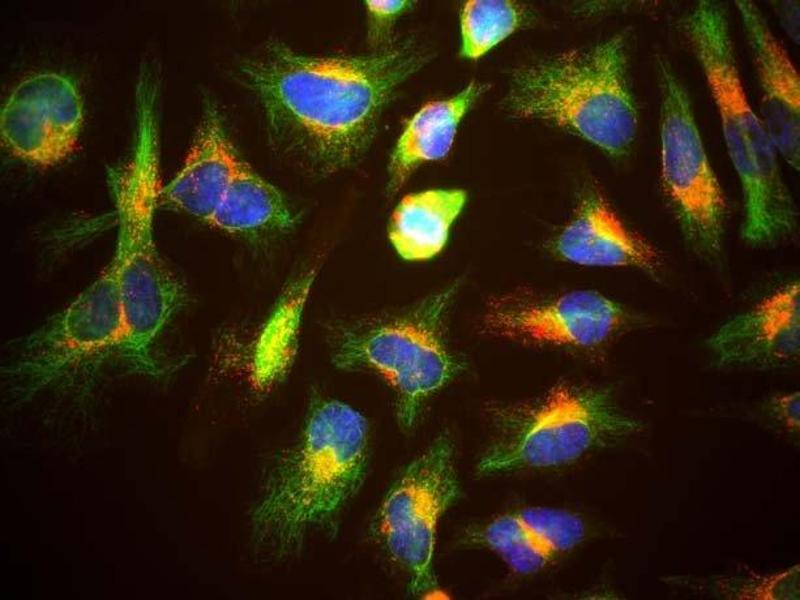 As the name suggests, LAMP1 is a protein primarily associated with the lysosomal membrane. Antibodies to LAMP1 are therefore excellent markers of lysosomes in mammalian cells, though some LAMP1 may also be seen on late endosomes and on the plasma membrane. In a typical cell LAMP1 is associated with spherical vesicles located next to the nucleus and the microtubule organizing center. The protein is also known as CD107a, lysosomal associated membrane glycoprotein 1, LGP120 and LAMPA, as the protein was independently discovered and named by several different labs. CD is an abbreviation for Cluster of Differentiation and refers to a protocol for the naming of proteins and other surface markers of human leucocytes defined by binding of specific monoclonal antibodies. LAMP1 is found on the cell surface of lymphocytes undergoing degranulation, a process in which cytoplasmic vesicles fuse with the plasma membrane, and this phenomena resulted in discovery of LAMP1 as a CD protein. The LAMP1 protein has a large N-terminal region which is inside the lysosome, hence topologically external to the cell, which is often refered to as the lumenal domain. The lumenal domain consists of two homologous globular seqments separated by a proline rich sequence. Next there is a single membrane spanning domain and a short 11 amino acid C-terminal cytoplasmic tail. This tail region contains, at the extreme C-terminus, a so-called YXXI motif which is responsible for the sorting of the intact molecule to the endosome and lysozome, where Y = tyrosine, I = isoleucine and X = almost any amino acid. This motif is found in several other lysosomal proteins, where it functions in the same way. There are 417 amino acids in the human LAMP1 molecule, giving a native molecular weight of 44.8 kDa. However the N-terminal lumenal segment of LAMP1 is very heavily and variably glycosylated due to the presence of 18 N-linked glycosylation sites, so that on SDS-PAGE and on Western blots the protein runs as a diffuse band at 90-120 kDa. The HGNC name for this protein is LAMP1.