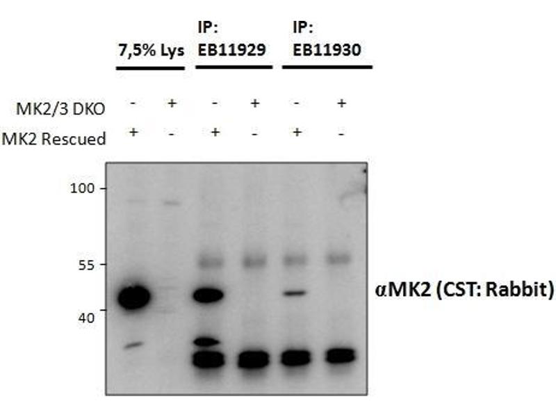 Immunoprecipitation: MK2/MK3 double knockout MEFs retrovirally transduced wiith MK2 or empty vector were lysed from confluent plates and used for IP with 1.5ug EB11929 or EB11930. Western blots of the IP were labelled with rabbit anti-MK2
