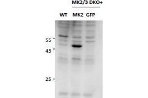 Western Blot: Approx 60 kDa band observed in Mouse Embryonic Fibroblasts (MEF) lysates, not present in the knockout MEFs and reappearing as a 45 kDa band upon reintroduction of MK2 gene expression through viral transduction (calculated MW of 44.0 kDa accord