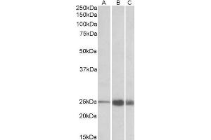 Western Blot: Approx 25 kDa band observed in Human, Mouse and Rat Skeletal Muscle lysates (calculated MW of 21.3 kDa according to NP_003273.1). Recommended concentration: 1-3 μg/mL.