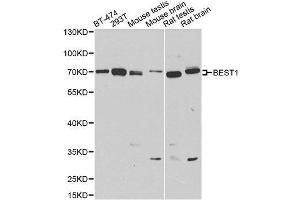 This gene encodes a member of the bestrophin gene family. This small gene family is characterized by proteins with a highly conserved N-terminus with four to six transmembrane domains. Bestrophins may form chloride ion channels or may regulate voltage-gated L-type calcium-ion channels. Bestrophins are generally believed to form calcium-activated chloride-ion channels in epithelial cells but they have also been shown to be highly permeable to bicarbonate ion transport in retinal tissue. Mutations in this gene are responsible for juvenile-onset vitelliform macular dystrophy (VMD2), also known as Best macular dystrophy, in addition to adult-onset vitelliform macular dystrophy (AVMD) and other retinopathies. Alternative splicing results in multiple variants encoding distinct isoforms.,BEST1,ARB,BEST,BMD,RP50,TU15B,VMD2,Cell Biology & Developmental Biology,Cell Adhesion,Neuroscience,BEST1