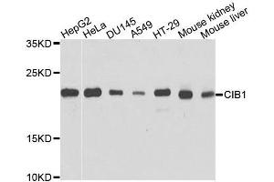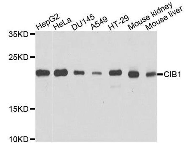 - This gene encodes a member of the EF-hand domain-containing calcium-binding superfamily. The encoded protein interacts with many other proteins, including the platelet integrin alpha-IIb-beta-3, DNA-dependent protein kinase, presenilin-2, focal adhesion kinase, p21 activated kinase, and protein kinase D. The encoded protein may be involved in cell survival and proliferation, and is associated with several disease states including cancer and Alzheimer's disease. Alternative splicing results in multiple transcript variants.,CIB1,CIB,CIBP,KIP1,PRKDCIP,SIP2-28,Signal Transduction,Cell Biology & Developmental Biology,Cell Adhesion,Cytoskeleton,Neuroscience,Calcium Signaling,CIB1