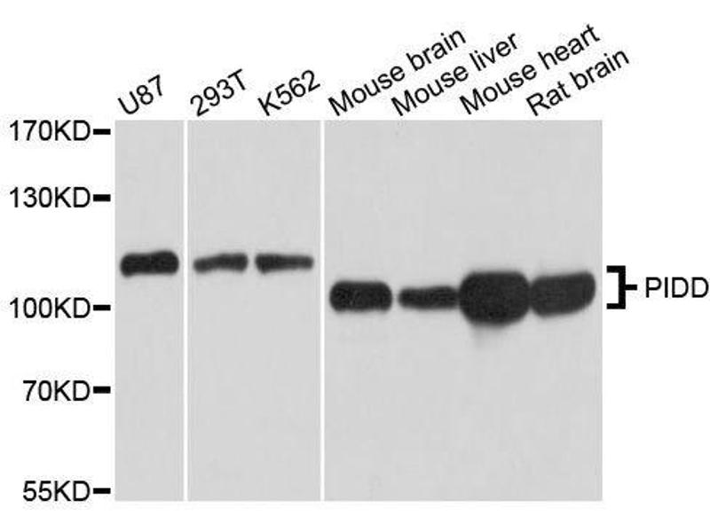 - The protein encoded by this gene contains a leucine-rich repeat and a death domain. This protein has been shown to interact with other death domain proteins, such as Fas (TNFRSF6)-associated via death domain (FADD) and MAP-kinase activating death domain-containing protein (MADD), and thus may function as an adaptor protein in cell death-related signaling processes. The expression of the mouse counterpart of this gene has been found to be positively regulated by the tumor suppressor p53 and to induce cell apoptosis in response to DNA damage, which suggests a role for this gene as an effector of p53-dependent apoptosis. Alternative splicing results in multiple transcript variants.,PIDD1,LRDD,PIDD,Cancer,Tumor suppressors,p53 pathway,Cell Biology & Developmental Biology,Apoptosis,Mitochondrial Control of Apoptosis,PIDD