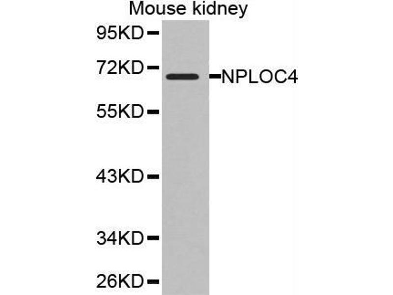 The ternary complex containing UFD1, VCP and NPLOC4 binds ubiquitinated proteins and is necessary for the export of misfolded proteins from the ER to the cytoplasm, where they are degraded by the proteasome. The NPLOC4-UFD1-VCP complex regulates spindle disassembly at the end of mitosis and is necessary for the formation of a closed nuclear envelope (By similarity. Acts as a negative regulator of type I interferon production via the complex formed with VCP and UFD1, which binds to DDX58/RIG-I and recruits RNF125 to promote ubiquitination and degradation of DDX58/RIG-I.,NPLOC4,NPL4,NPL4 homolog,Signal Transduction,NPLOC4
