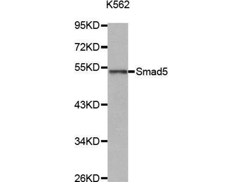 The protein encoded by this gene is involved in the transforming growth factor beta signaling pathway that results in an inhibition of the proliferation of hematopoietic progenitor cells. The encoded protein is activated by bone morphogenetic proteins type 1 receptor kinase, and may be involved in cancer. Alternative splicing results in multiple transcript variants.,DWFC,JV5-1,MADH5,SMAD5,Epigenetics & Nuclear Signaling,Signal Transduction,Cell Biology & Developmental Biology,TGF-b-Smad Signaling Pathway,ESC Pluripotency and Differentiation,Stem Cells,SMADs,Smad5