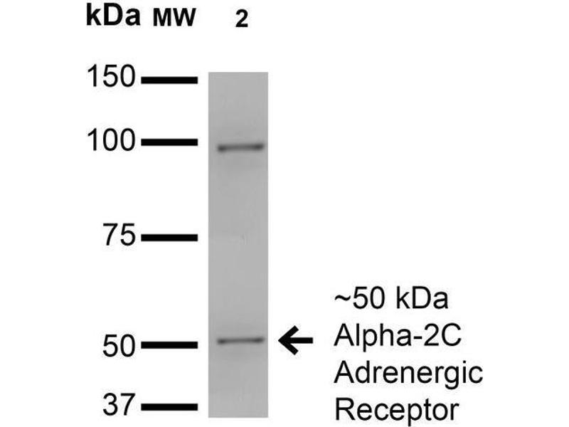 1 μg/ml of ABIN1686644 was sufficient for detection of Alpha2C Adrenergic Receptor in 20 μg of COS cells transiently transfected with HA-tagged Alpha- lysate and assayed by colorimetric immunoblot analysis using goat anti-mouse IgG:HRP as the secondary antibody.