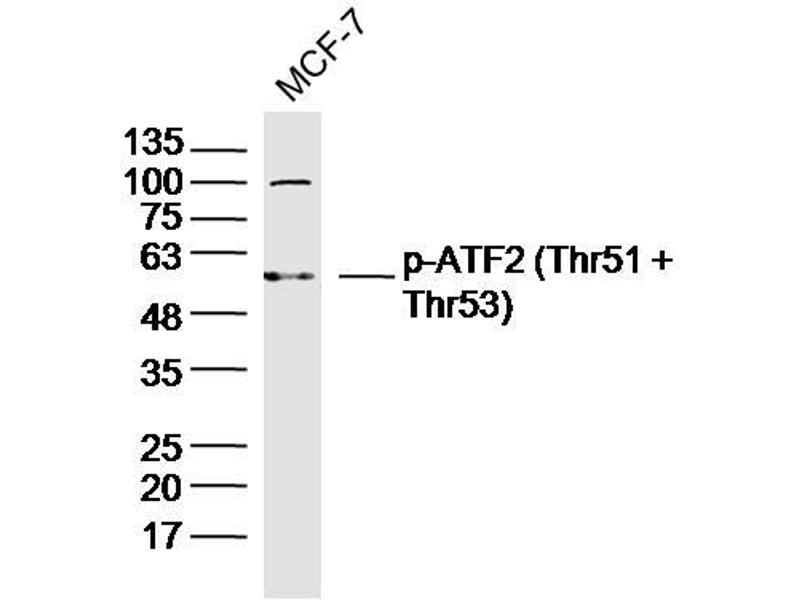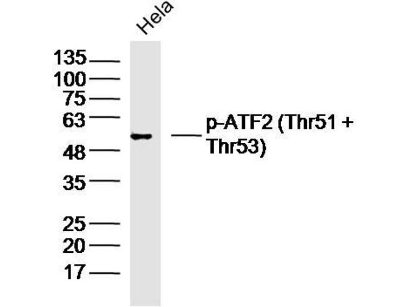 Synonyms: ATF2 phospho T51 + T53, p-ATF2 phospho T51 + T53, ATF2 phospho Thr51 + Thr53, p-ATF2 phospho Thr51 + Thr53, CREB 2, HB 16,Activating Transcription Factor 2, ATF 2, Atf-2, ATF2 protein, cAMP Response Element Binding Protein 2, cAMP response element binding protein CRE BP1, cAMP-dependent transcription factor ATF-2, cAMP-responsive element-binding protein 2, CRE BP1, CRE-BP, CREB 2, CREB2, CREBP1, Cyclic AMP dependent transcription factor ATF 2, Cyclic AMP-responsive, ATF2_HUMAN.
