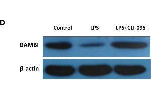 Background: BAMBI is a membrane spanning glycoprotein that acts as a negative regulator of TGF-beta signaling during development. The BAMBI family of proteins are related to type I TGF-beta receptor family, however, BAMBI is a pseudoreceptor that lacks an intracellular serine/threonine kinase domain. BAMBI transcription regulation is under the influence of beta-catenin, BMP, smad3 and smad4. BAMBI expression can increase in colorectal and hepatocellular carcinomas relative to non-cancerous tissues. BAMBI is expressed at high levels during odontogenesis. BAMBI is coexpressed with Bmp-4 during early Xenopus embryogenesis and can be detected in poorly metastatic human melanoma cell lines.
