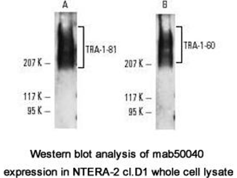 This antibody reacts with the neuraminidase resistant form of the TRA-1-60 antigen that is expressed upon the surface of human teratocarcinoma stem cells (EC), human embryonic germ cells (EG) and human embryonic stem cells (ES)