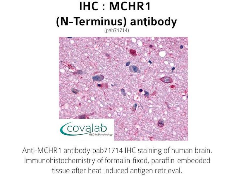 - Synthetic 20 amino acid peptide from N-terminal extracellular domain of human MCHR1. Percent identity with other species by BLAST analysis: Human, Chimpanzee, Gibbon, Panda, Pig (100%), Monkey (95%), Bovine, Horse (90%), Dog (85%), Mouse, Hamster, Rabbit (80%).