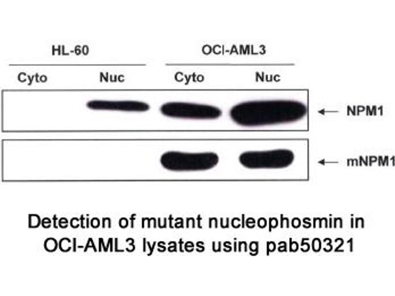 - The nucleophosmin antibody ABIN1737584 reveals a protein of the expected molecular weight in lysates of OCI-AML3 and of HEK-293T transfected with GFP-NPM mutA. The protein band is but not visible in the HL-60 negative control. A weak band from OCI-AML3 detected by an anti-NPMwt antibody confirms the concurrent presence of both NPMmutA and NPMwt in the OCI-AML3 cell line.