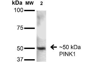 1 μg/ml of ABIN1741107 was sufficient for detection of PINK1 in 20 μg of rat brain lysate by colorimetric immunoblot analysis using Goat anti-mouse IgG:HRP as the secondary antibody.