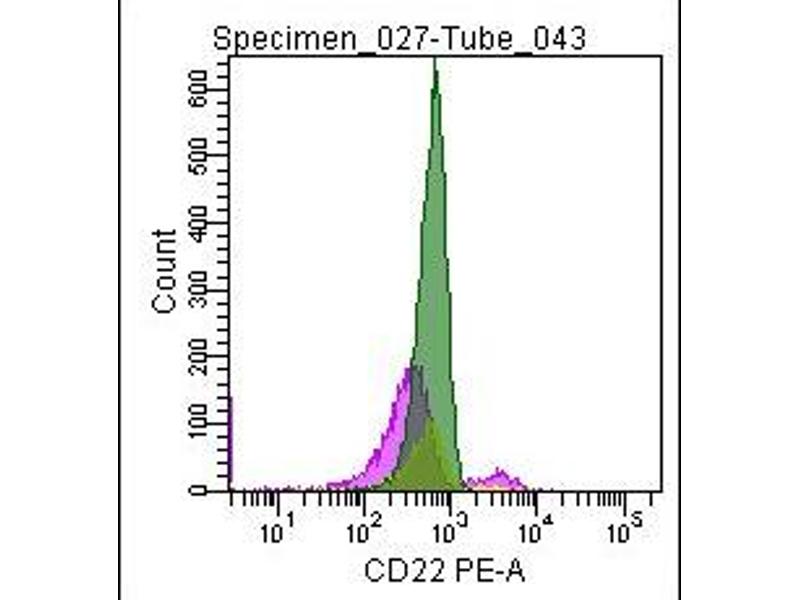 - Staining Procedure for Surface CD22: Direct Immunofluorescence (Staining Procedure) fluorochrome labeled antibodies are designed for use with either whole blood or isolated mononuclear cell (MNC) preparationsProposed staining procedure for whole blood in short: - For each sample add 50 µL of EDTA anti-coagulated blood to a 3-5 mL tube - Add 20 µL of the appropriate monoclonal antibody conjugate - Incubate the tube for 15 minutes at 4°C or at room temperature in the dark - Add 100 µL -LYSE (ABIN1741580) to each tube and incubate for 10 minutes at room temperature - Add 3-4 mL of destilled water and vortex, incubate for 5-10 minutes at room temperature- Centrifuge tube for 5 minutes at 300 g - Aspirate supernatant and resuspend pellet in 0.3 mL of sheath fluid - Analyze immediately or store samples at 2-8° C in the dark and analyze within 24 hoursFor \No-Wash\ Proposed staining procedure for MNC in short: - Carefully add 20 µL antibody conjugate and 50-100 µL MNC to the bottom of a tube - Vortex at low speed for 1-2 seconds - Incubate for 15-30 minutes at 2-8°C or at room temperature - Centrifuge tubes for 5 minutes at 300 g - Remove supernatant, resuspend cells in 2-5 mL of phosphate buffered saline (PBS) and centrifuge cells again for 5 minutes at 300 g - Remove supernatant and resuspend cells in sheath fluid for immediate analysis or resuspend cells in 0.5 mL 1 % formaldehyde and store them at 2-8°C in the dark. - Analyze fixed cells within 24 hours Indirect Immunofluorescence (Staining Procedure) - Mix 20 µL purified antibody with 50 µL whole blood or MNC suspension - Incubate for 15 minutes at 2-8°C - Wash cells with phosphate buffered saline (PBS)- Add to cell pellet 20 µL of affinity purified, fluorochrome labeled F(ab')2 anti mouse Ig antibodies - Incubate for 15 minutes at 2-8°C - Wash cells with phosphate buffered saline (PBS) or proceed as described for direct stainingStaining Procedure for Cytoplasmatic CD22: Permeabilization and Staining Procedure - In combination with our Permeabilization Kit FIX&PERM® (ABIN1741575) intracellular CD22 can be easily stained in cell suspensions. - For each sample to be analyzed add 50 µL of whole blood, bone marrow or mononuclear cell suspension in a 5 mL tube- Add 100 µL of Reagent A (Fixation Medium, stored and used at room temperature) - Incubate for 15 minutes at room temperature - Add 5 mL phosphate buffered saline and centrifuge cells for 5 minutes at 300 g - Remove supernatant and add to cell pellet 100 µL Reagent B (Permeabilization Medium) and 20 µL of the CD22 monoclonal antibody conjugate - Vortex at low speed for 1-2 seconds - Incubate for 15 minutes at room temperature - Wash cells with phosphate buffered saline as described above - Remove supernatant and resuspend cells in sheath fluid for immediate analysis or resuspend cells in 0.5 mL 1.0 % formaldehyde and store them at 2- 8°C in the dark. - Analyze fixed cells within 24 hours.