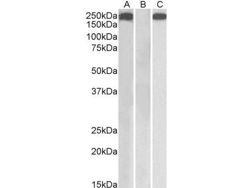 Western Blot: In transfected HEK293 transiently expressing Human THBS1 a band of approx. 200 kDa is observed. This band is not observed in the non-transfected HEK293. The calculated molecular size is 129 kDa according to NP_003237.2. Recommended concentrat