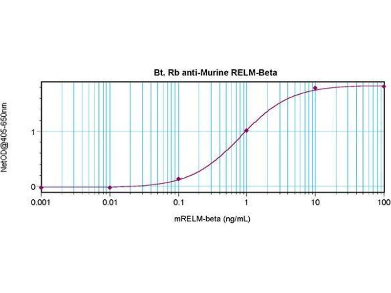 ELISA: Direct: To detect mRELMβ (using 100 μL/well antibody solution) a concentration of0.25 - 1.0 μg/mL of this antibody is required. In conjunction with compatible secondaryreagents, it allows the detection of at least 0.2 - 0.4 ng/well of recombinant mRELMβ. Sandwich: To detect mRELMβ (using 100 μL/well antibody solution) a concentration of0.25 - 1.0 μg/mL of this antibody is required. In conjunction with Polyclonal Anti-MurineRELMβ as a capture antibody, it allows the detection of at least 0.2 - 0.4 ng/well ofrecombinant mRELMβ. Western Blot: To detect mRELMβ by Western Blot analysis this antibody can be used at aconcentration of 0.1 - 0.2 μg/mL. Used in conjunction with compatible secondary reagentsthe detection limit for recombinant mRELMβ is 1.5 - 3.0 ng/lane, under either reducing ornon-reducing conditions. Other applications not tested. Optimal dilutions are dependent on conditions and should be determined by the user.