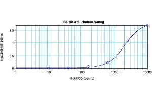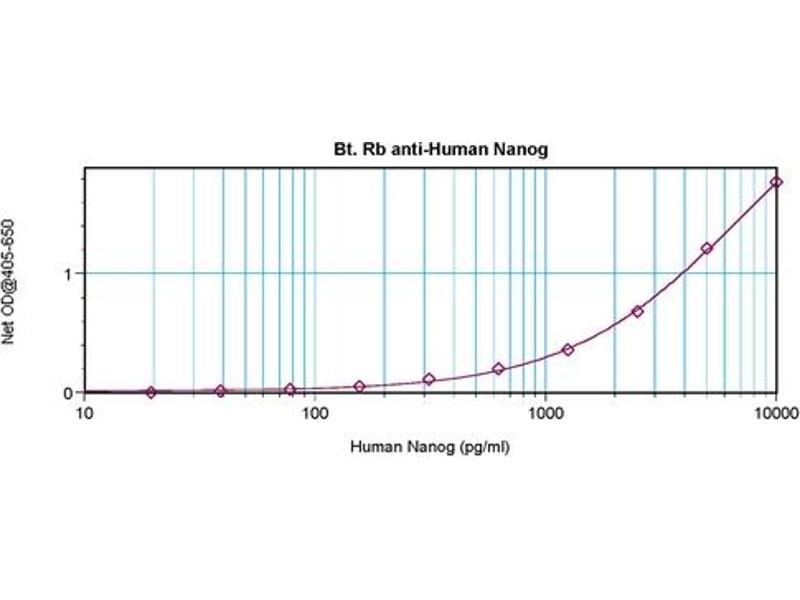 ELISA: Direct: To detect hNanog (using 100 μL/well antibody solution) a concentration of0.25 - 1.0 μg/mL of this antibody is required. In conjunction with compatible secondaryreagents, it allows the detection of at least 0.2 - 0.4 ng/well of recombinant hNanog. Sandwich: To detect hNanog (using 100 μL/well antibody solution) a concentration of0.25 - 1.0 μg/mL of this antibody is required. In conjunction with Polyclonal Anti-HumanNanog as a capture antibody, it allows the detection of at least 0.2 - 0.4 ng/well ofrecombinant hNanog. Western blot: To detect hNanog this antibody can be used at a concentration of0.1 - 0.2 μg/mL. Used in conjunction with compatible secondary reagents the detectionlimit for recombinant hNanog is 1.5 - 3.0 ng/lane, under either reducing or non-reducingconditions.