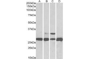 Western Blot: Approx 28 kDa band observed in Human, Mouse, Rat and Pig Liver lysates (calculated MW of 28.8 kDa according to NP_002620.1, NP_000281.2 and of NP_001025062.1). The additional 30 kDa band observed in the rodent lysates likely represent the acet