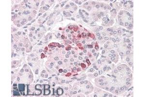 Immunohistochemistry: In paraffin embedded Human Pancreas shows cytoplasm staining on select beta cells in islet of Langerhans. Recommended concentration, 3-6 μg/mL.
