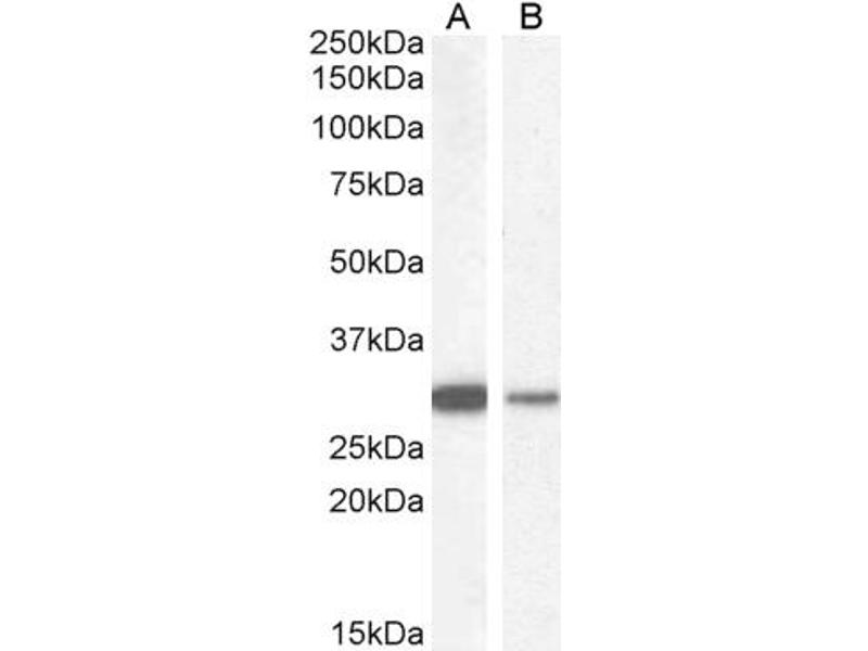 Western Blot: Approx. 30 kDa band observed in lysates of cell lines U251 and HepG2 and in Human Kidney, Lung and Duodenum lysates, and approx. 30-32 kDa band in Rat Kidney, Lung and Duodenum lysates (calculated MW of 30.9 kDa according to Human NP_000894.1