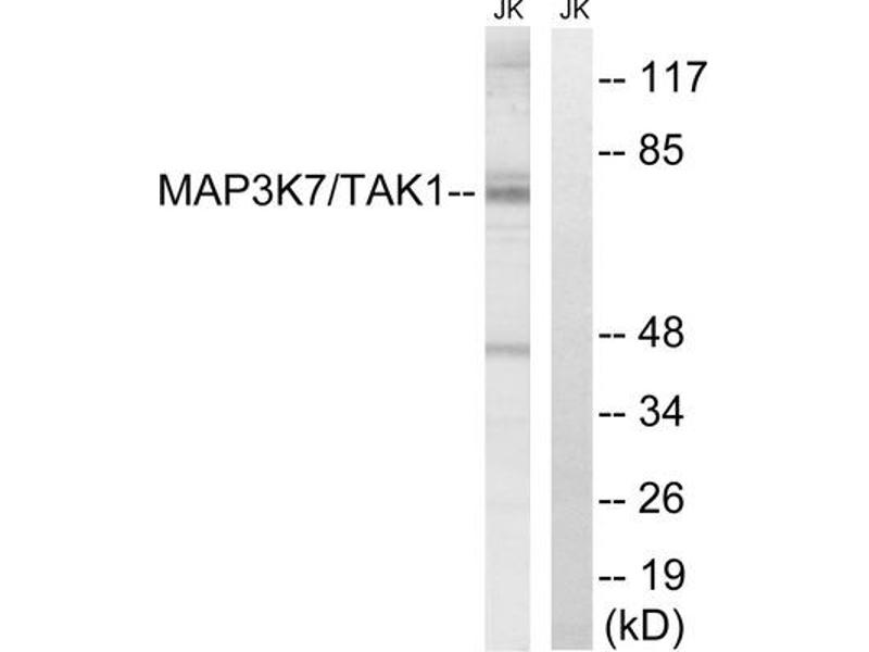 The antiserum was produced against synthesized non-phosphopeptide derived from human MAP3K7 around the phosphorylation site of threonine 187 (H-M-TP-N-N).