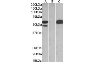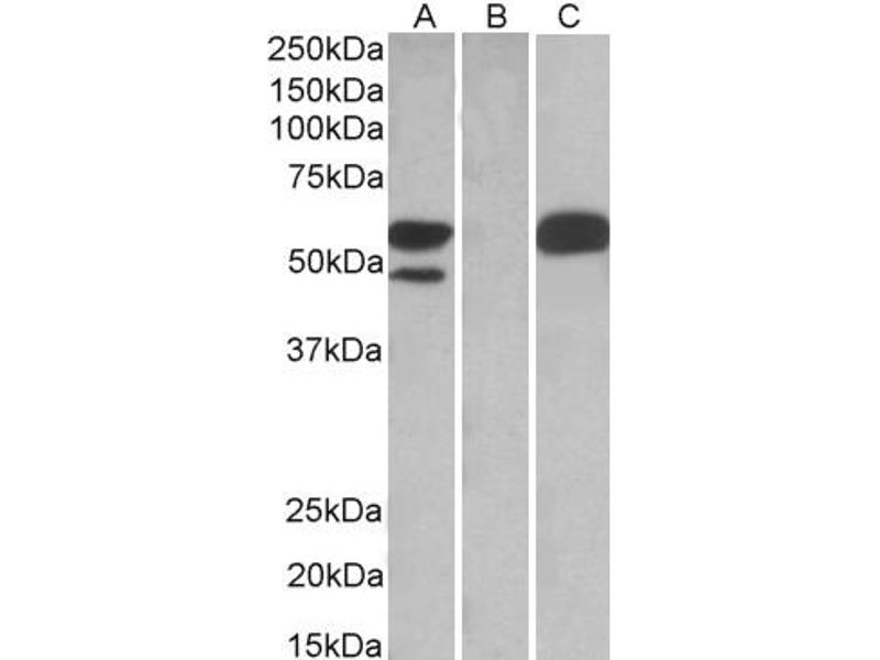 Western Blot: In transfected HEK293 transiently expressing full-length Human TRIM21 (myc and DYKDDDDK tagged), a band of approx. 60 kDa was observed. No bands were observed in mock-transfected HEK293 and the same band was observed using anti-myc tag antib