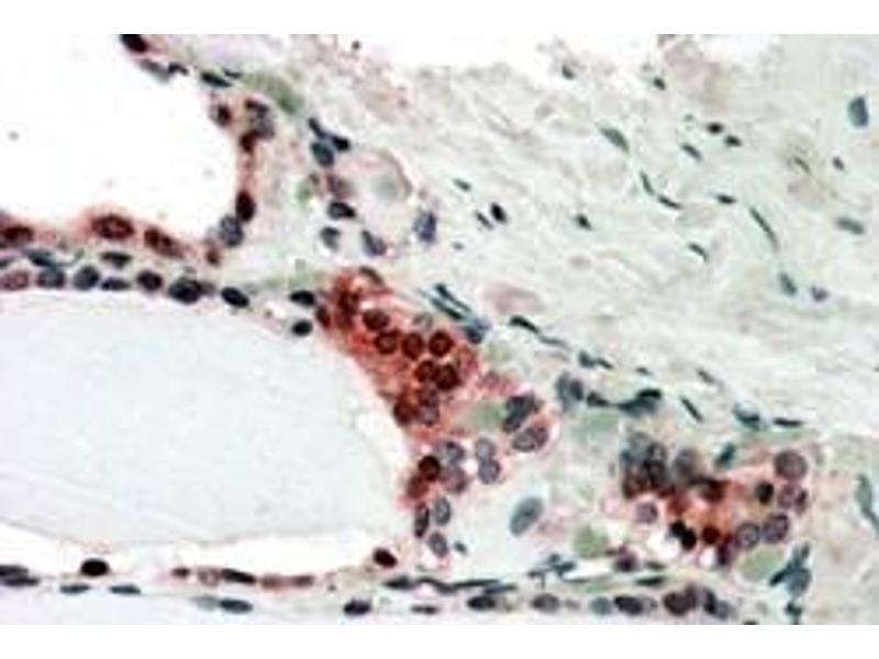 Immunohistochemistry: In paraffin embedded Human Thyroid Gland shows nuclear and cytoplasm staining in activated epithelial cells Recommended concentration: 3-5 μg/mL.